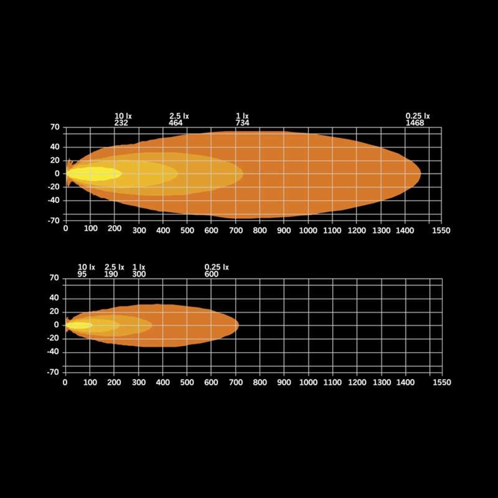 - Udvidet rækkevidde og bredere lysbillede: Se længere og få et dramatisk bredere synsfelt – over fire gange bredere end bilens almindelige fjernlys – hvilket gør det muligt at forudse potentielle farer og reagere mere effektivt. Denne løsning har et faktisk lysudbytte på 4979 lumen og belyser 418m (ved 1 LUX), hvilket giver enestående sigt.