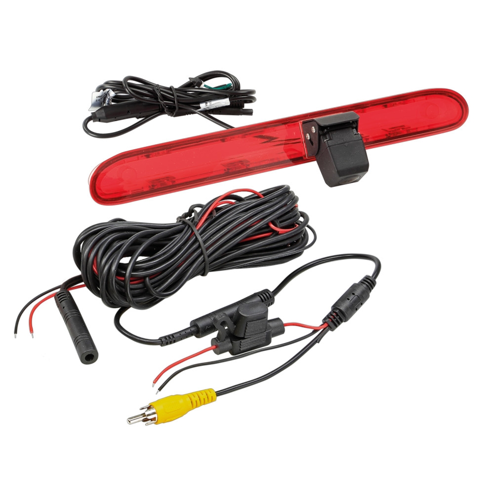 Leveringsomfanget inkluderer kameraet med et 1 meter langt kabel og 4-polig mini-stik, et 6,5 meter langt forlængerkabel med 3 meter strømkabel til tilslutning til baglygten samt et 0,2 meter strømkabel med sikring og videokontakt (RCA).