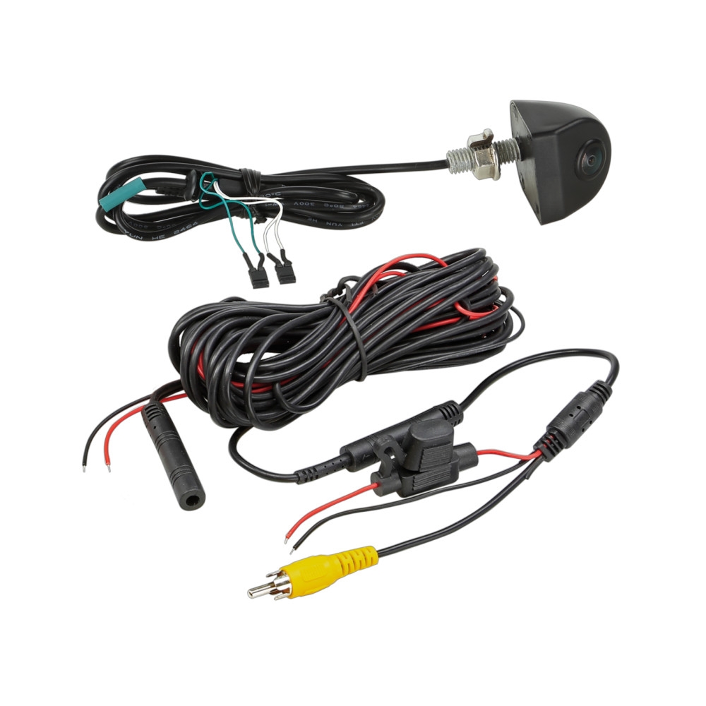 Til installation medfølger en plastkile til bakkamera med 5° hældning, samt flere tilbehør til at forbinde kameraet til forskellige grænseflader og strømkilder.