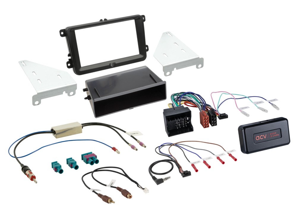 Inkluderer: 2-DIN facade med opbevaringsrum, i-adapter til Skoda/VW, 40-pin Quadlock Multilead, antenneadapter Fakra(m) til DIN(m), 12V phantom.