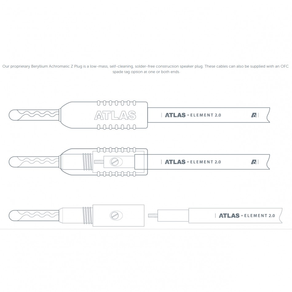 Atlas Element Bi-Wire Achromatic Z er en færdigtermineret højttalerkabel, som sælges i stereopar og er fremstillet i Atlas-fabrikken. Modellen indgår i den mest overkommelige Element-serie, og er opbygget med separate ledere for bas og diskant. Man har forskellige lederarealer og teknikker for at optimere overførslen til max. Basdelen har mange trådede kardeler og et areal på 2 mm², mens diskantdelen har en solid leder på 1,1 mm². Som ledermateriale har man OFC-kobber, og i modsætning til markedets konkurrenter, så er lederne ikke klædt i en PVC-kappe, men her anvender man sig af en høj-densitets PEF-isolering (skummet polyethylen). Et dyrere materiale at bruge, men som også har en mindre indvirkning på lederne, når disse overfører et strømbærende signal. Nytt er deres Achromatic Z bananplugg, som er fremstillet i beryllium kobber og har en lav masse, er selvrensende og helt loddefri.