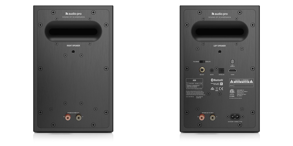 Både A26 och A36 är äkta stereohögtalare, alltså att man har två fysiska kabinett. Fördelen med detta - jämfört med en single-stereo högtalare - är att ljudbilden blir bredare och därmed öppnar upp sig då mer ljud fylls ut i hela rummet. Den inbyggda förstärkaren sitter i den vänstra högtalaren, som sedan sammanlänkas med den högra via en hederlig högtalarkabel. Så tänk på att den aktiva sidan skall alltså stå på vänster sida om platt-TV:n.