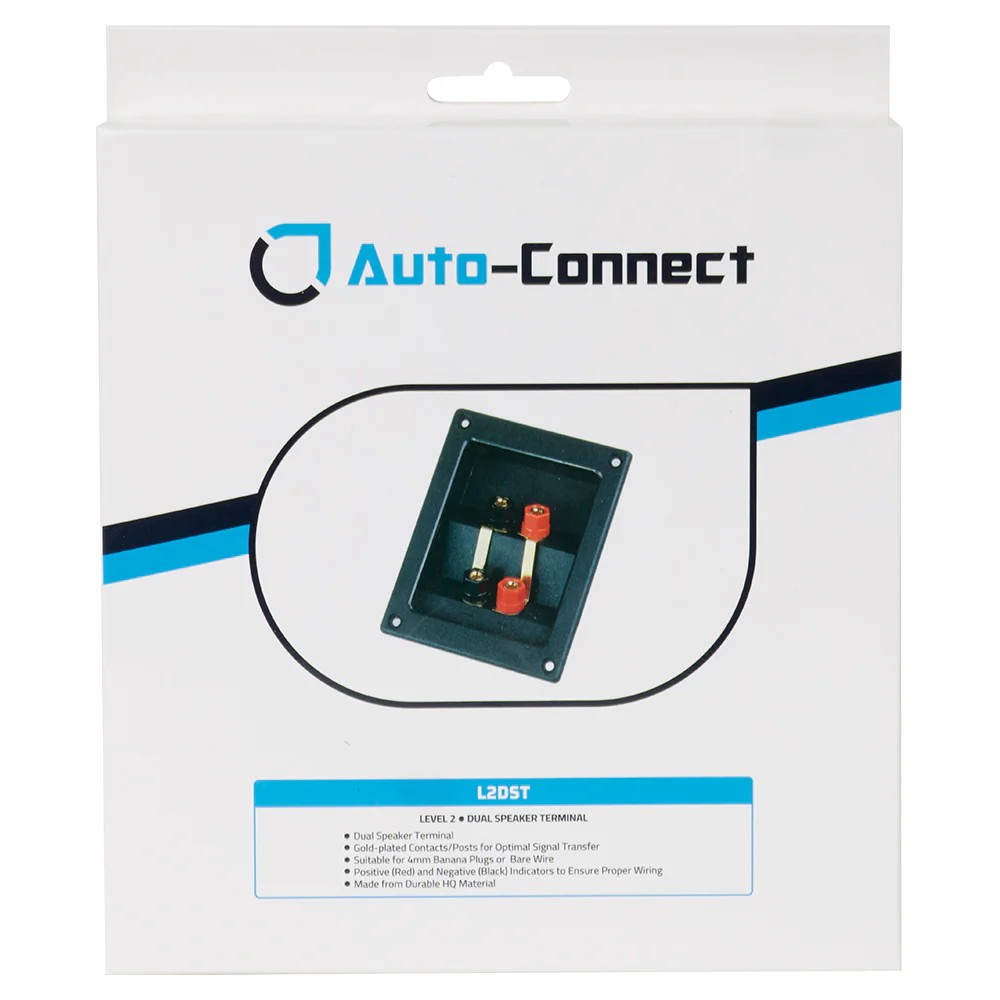 Auto-Connect L2DST er en dobbelt højttalerterminal beregnet til stilfulde og pålidelige tilslutninger i højttaler- og baskasser. Terminalen består af to par guldbelagte tilslutninger monteret på et indfældet panel, der giver en stabil og letinstallerbar løsning for både interne og eksterne højttalerkabler. Konstruktionen passer lige godt i delte kasser, stereoløsninger og mere avancerede byggerier med bi-wiring eller bi-amping.