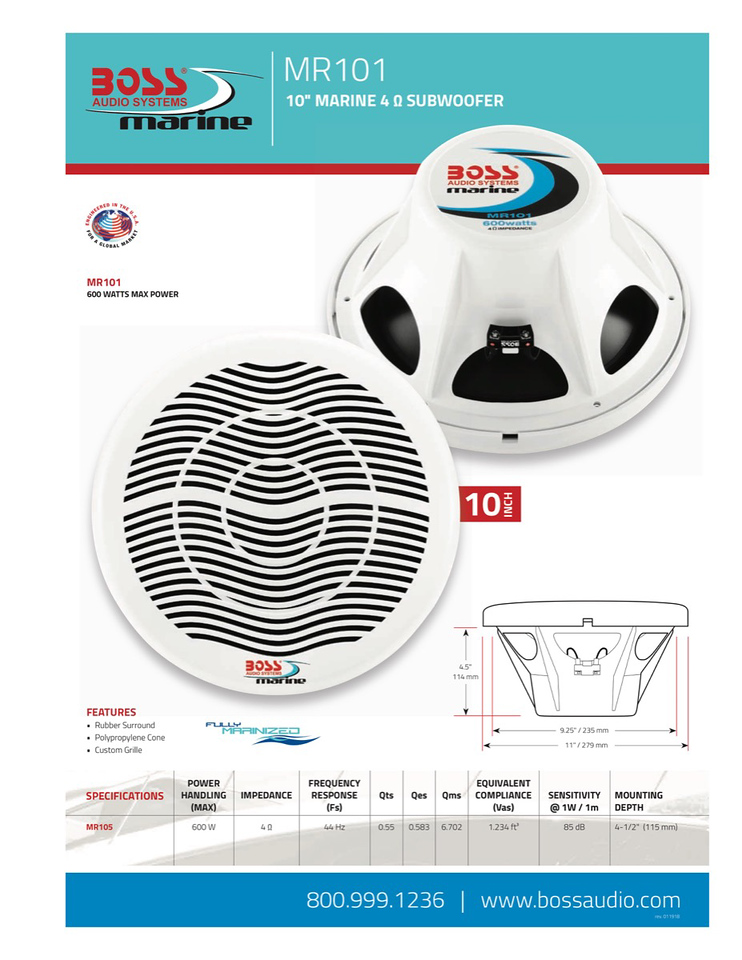 BOSS MR101 är en 10tummare som kan användas i blöta miljöer, vilket passar perfekt i din båt. Utöka ditt ljudsystem med denna bas som ger 300W RMS i 4 ohm, med en känslighet på 85dB. Med denna kommer du att få ett bra basljud garanterat i båten.