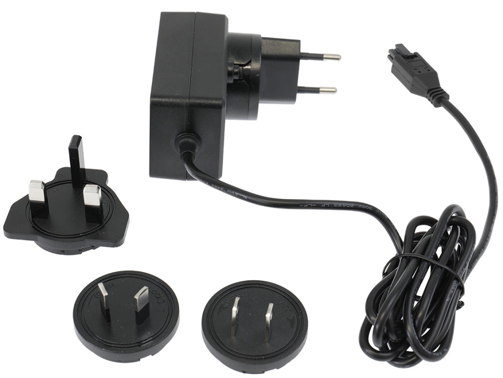Brodit 941026 – Ladekabel. Med 220V-stik, 5,4V 2,7A og 6-polet Molex-udgang. EU-, US-, UK- og AU-adaptere medfølger. Vægoplader med 6-polet Molex. Bruges, hvis man ønsker at opgradere sin Aktive holder til 220V opladning.