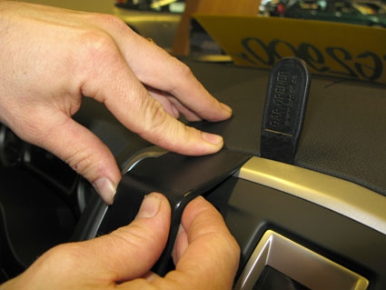 2. Pres sprækkeåbneren ind mellem rammen, der omgiver kontrolpanelet og instrumentbrættet. Hæng fæstets vinklet øverste del i sprækken ved siden af sprækkeåbneren.