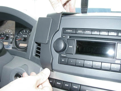 3. Pres nedad på beslaget, og derefter fremad på beslagets nederste del, så den vinklet kant hægter fast i sprækken mellem rammen omkring stereoen og kontrolpanelet.