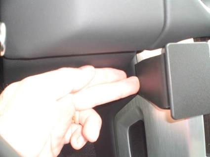 1. Brug den medfølgende vådserviet til at rengøre området, hvor ProClip-fæstet skal monteres. Fjern beskyttelsesfilmen på den dobbeltsidede tape på ProClip-fæstet. Pres den medfølgende sprækkeåbner ind i sprækken mellem panelet omkring midterkonsollen og konsollens kantpanel for at udvide sprækken. Pres den vinklet højre del af fæstet ind i sprækken over sprækkeåbneren. Fjern sprækkeåbneren.