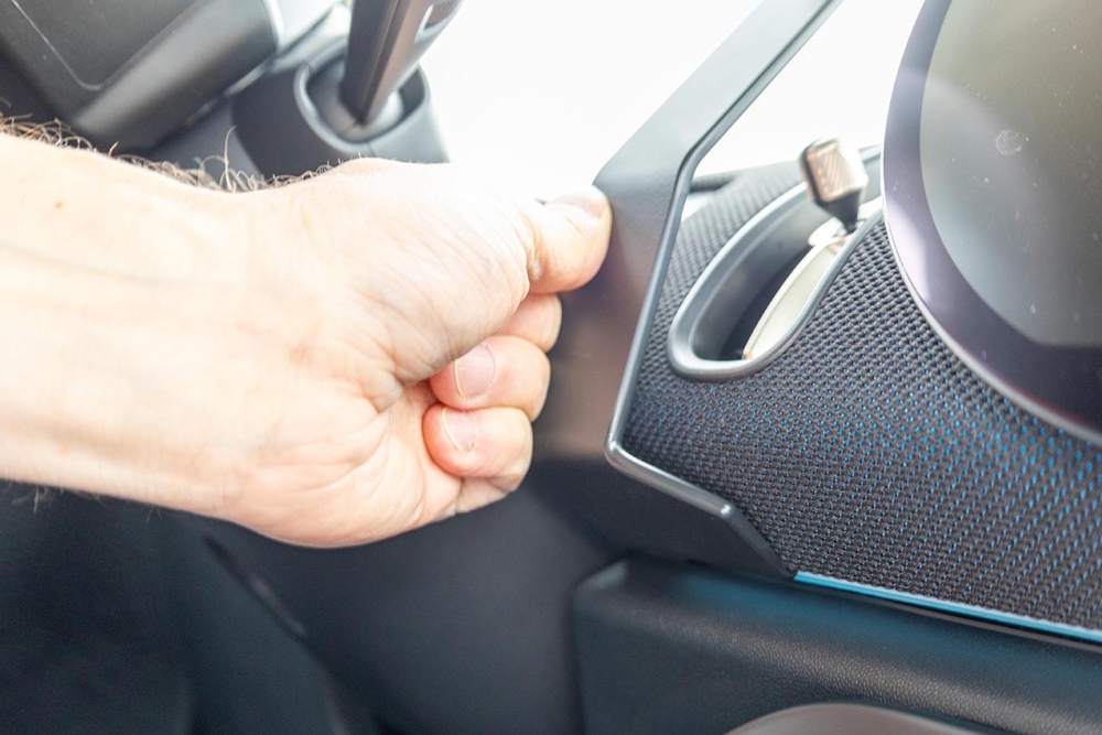 1. Hæng fæstets nederste del fast under instrumentbrættets panel, lige ved ratstangen.