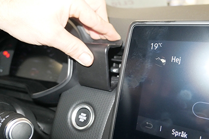 1. Pres beslagets vinklet nederste del ind i sprækken mellem rammen, der omgiver luftventilen, og instrumentbrættet.