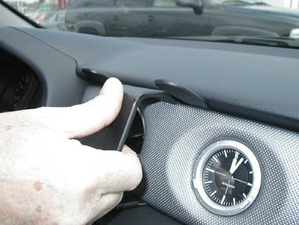 3. Pres fjederåbnerne ind i sprækken mellem rammen, der omgiver luftventilen og kontrolpanelet, en på hver side af holderen. Pres fremad på holderens nederdel, så den sporfræsede nederdel går i sprækken mellem fjederåbnerne. Pres indtil du hører/føler, at den klikker på plads. Fjern fjederåbnerne.