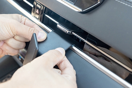 1. Brug den medfølgende vådserviet til at rengøre området, hvor ProClip-fæstet skal monteres. Fjern beskyttelsesplastikken på den dobbeltsidede tape. Pres fæstets nederste del ind i sprækken mellem klimaanlæggets kontrolpanel og instrumentbrættet.