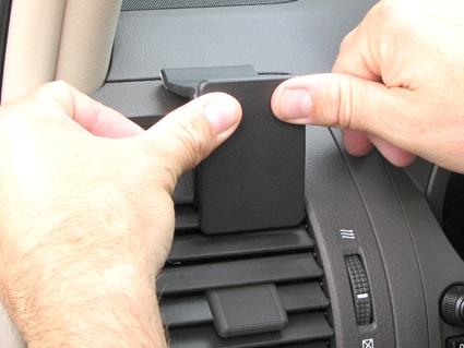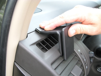 2. Pres beslaget fremad, så den vinklet øverste del hægter fast i sprækken mellem rammen omkring luftventilen og instrumentbrættet.