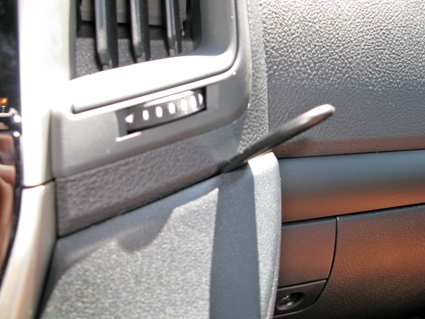 1. Pres den medfølgende sprækkeåbner ind i sprækken, som deler venstre side af midterkonsollen, for at udvide sprækken. Brug den medfølgende vådserviet til at rengøre området, hvor ProClip-beslaget skal monteres. Fjern beskyttelsesplastikken på den dobbeltsidede tape på ProClip-beslaget. Drej luftventilerne mod højre.