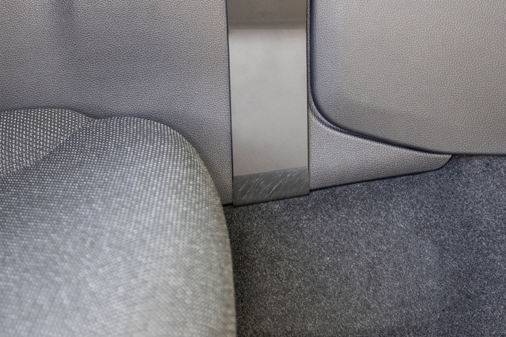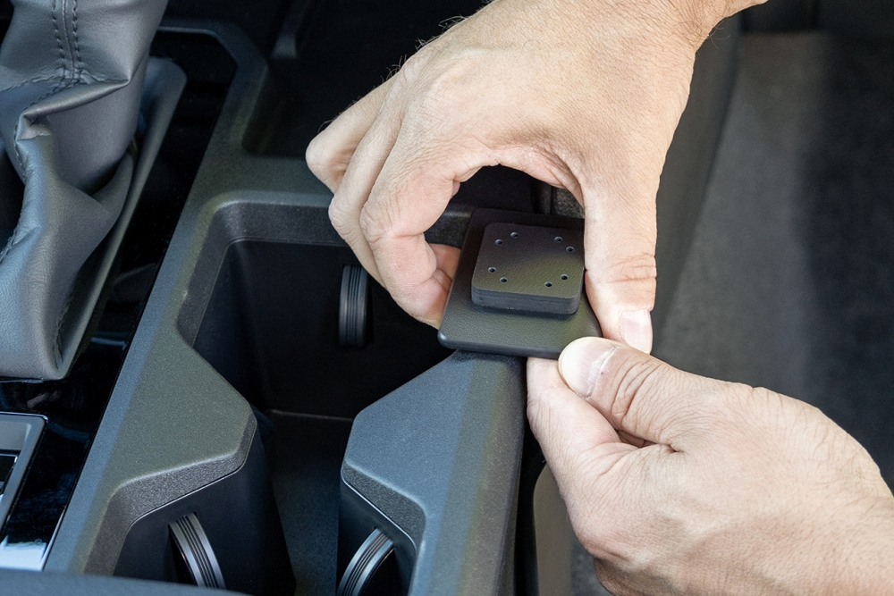 1. Brug den medfølgende vådserviet til at rengøre området, hvor fæstet skal monteres. Fjern beskyttelsesplast på den dobbeltsidede tape. Hæng monteringsbeslaget nederst under midterkonsollens sidevæg, lige ved den forreste konsolpanel.