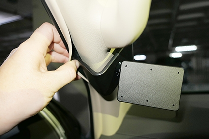 3. Pres fæstet frem/opfrem, så den vinklet overkant hænger fast om A-stolpen ved forruden. Pres nedad på fæstets overdel, så den vinklet kant hænger godt fast om A-stolpen.