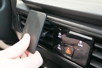 1. Brug den medfølgende vådserviet til at rengøre området, hvor ProClip-fæstet skal monteres. Fjern beskyttelsesplastikken på den dobbeltsidede tape på fæstet. Fastgør fæstets rillede overdel under rammen, der omgiver luftventilen.