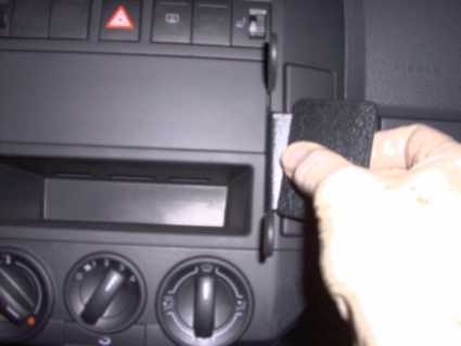1. Pres de medfølgende sprækkeåbnere ind i sprækken mellem stereoen/møntbakken og den omgivende ramme for at udvide sprækken. Fjern beskyttelsesplastikken på de dobbeltsidede tape-strimler på ProClip-holderen. Pres venstre del af holderen ind i sprækken mellem sprækkeåbnerne.