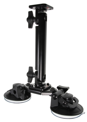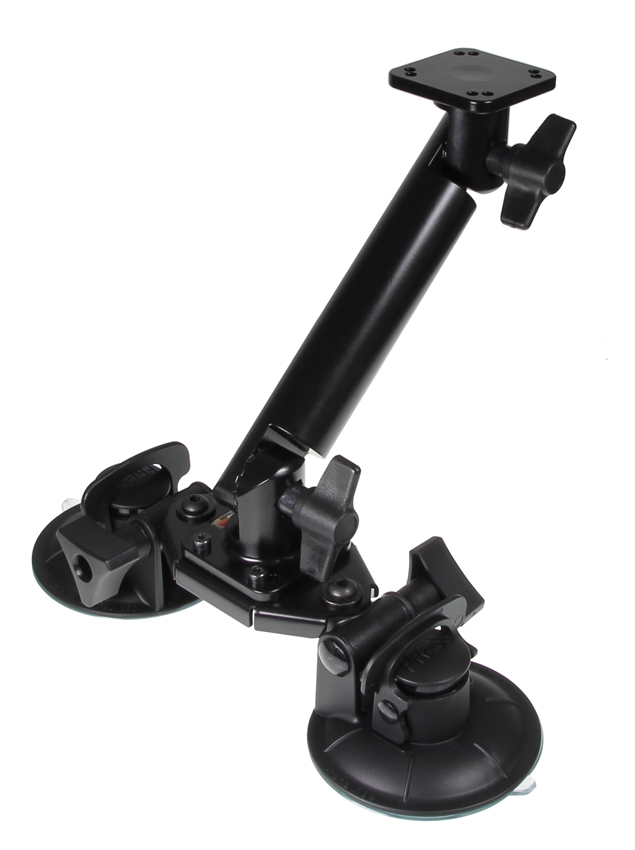 Den dobbelte sugekoppen med PM-feste giver en stærk montering på de fleste flade overflader. PM-festet kan let vinkles i trin om 24°, op til maksimalt 192° (8 forskellige positioner), ved at løsne vingmutterne. Monteringspladen er 50x50 mm og har dobbelte AMPS-huller.