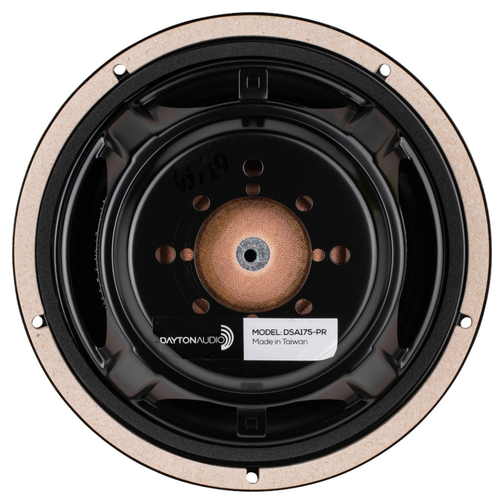 Dayton Audio DSA175-PR er en 6,5-tommers passiv radiator i Designer Series, udviklet til mindre højttalerbyggerier, hvor en traditionel portløsning fylder for meget eller er svær at få til at fungere godt. Den matcher Dayton Audios basenheder i aluminium i samme serie både visuelt og mekanisk, med stålkurv, anodiseret aluminiumskegle og gummiophæng. På bagsiden findes en gevindløsning til ekstra vægt, hvilket gør det nemt at justere afstemningen efter kabinet og anvendelse.