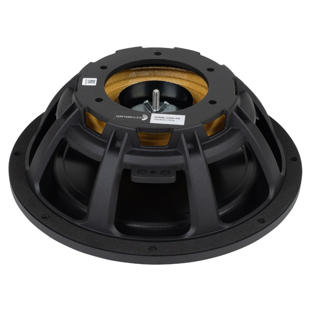Dayton Audio SS10-PR er en 10-tommers passiv radiator i Signature Series, bygget til at give mere dybbas fra kompakte kabinetter uden at bruge plads på lange porte. Den er designet som partner til SS10-22 og deler samme udseende med en støbt aluminiumsramme, anodiseret aluminiums kegle og gummiophæng. Derudover har den Dayton Audios SMS-løsning, hvor den ekstra masse placeres mellem spider og ophæng for at give en stabil og symmetrisk bevægelse, selv når udslagene bliver store.