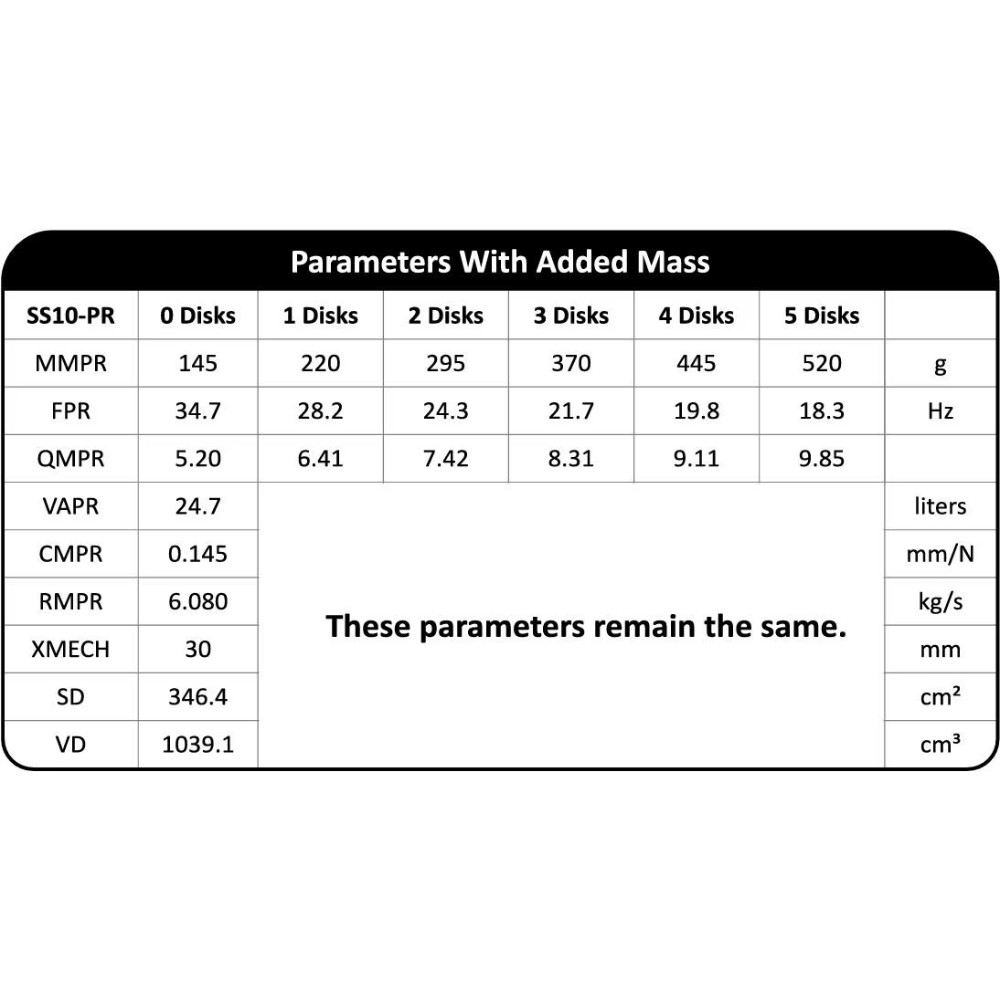 En passiv radiator er ideel, når man vil nå dybere frekvenser uden at bygge en stor kasse eller bruge en port, der kræver for meget plads. SS10-PR er let at arbejde med i den type projekter. De medfølgende vægte gør det muligt at justere den bevægelige masse efter kabinet og tuning, og SMS-konstruktionen hjælper med at holde bevægelsen i balance. Sammen med den robuste konstruktion gør det SS10-PR til en gennemtænkt løsning i kompakte basbyggerier.