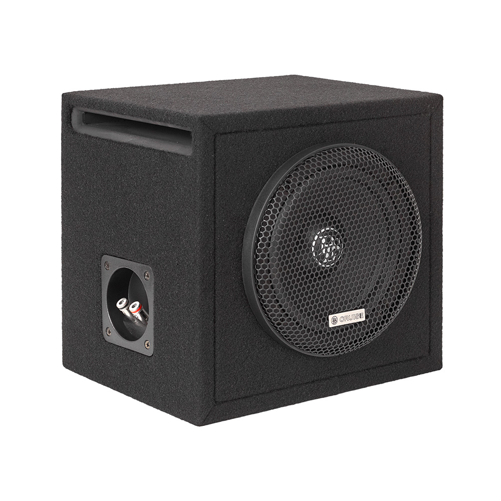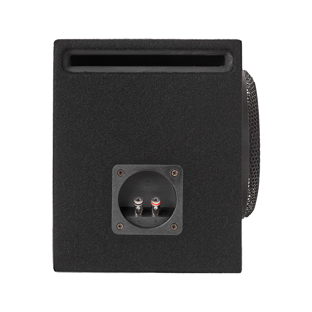 Kassen er formbygget til at forsvinde i bilen, med skjult placering og en finish, der føles gennemarbejdet. Stabilt kabinet, tydelig terminalplacering og beskyttelsesgitter i metal gør installationen robust og klar til langvarig brug. Basreflekskonstruktionen med spalteport er valgt for sin effektivitet i lille volumen og dens måde at bevare kontrollen på, når du skruer op for volumen. I praksis betyder det en bund, der føles tæt, fleksibel og let at integrere med frontsystemet.