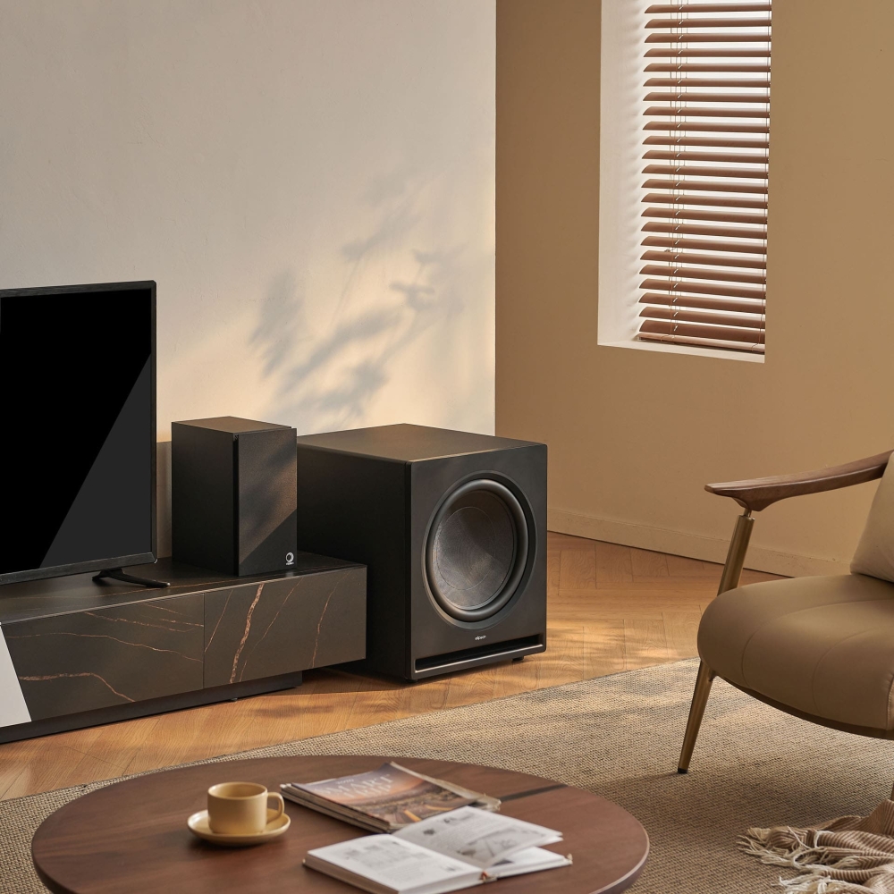 - Designet til store rum og højtydende hjemmebiografsystemer