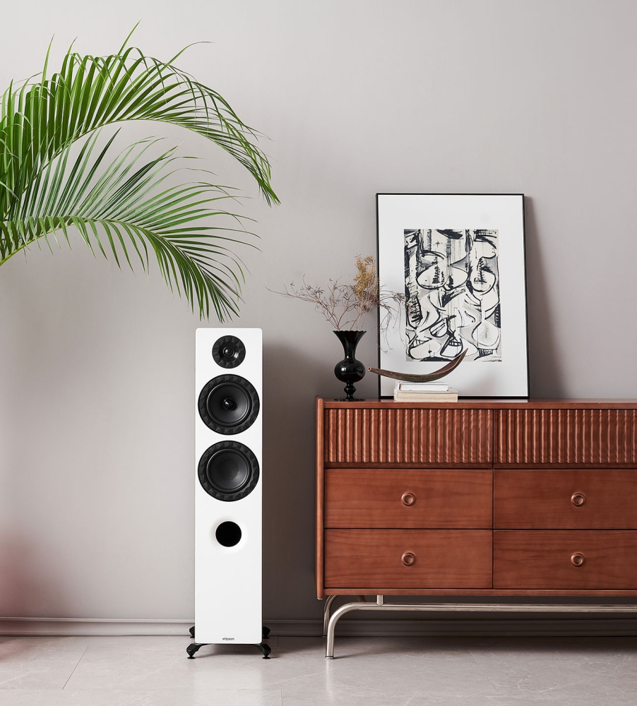Højttaleren har et solidt chassis med intern afstivning, der reducerer uønskede vibrationer og giver mere stabil lydgengivelse. Den matte hvide overflade er elegant og let at matche med hjemmemiljøer. Premium bindingerne sikrer optimal kontakt med forstærkeren og langvarig mekanisk stabilitet. Samlet set en robust og stilren højttaler bygget til langvarig brug.