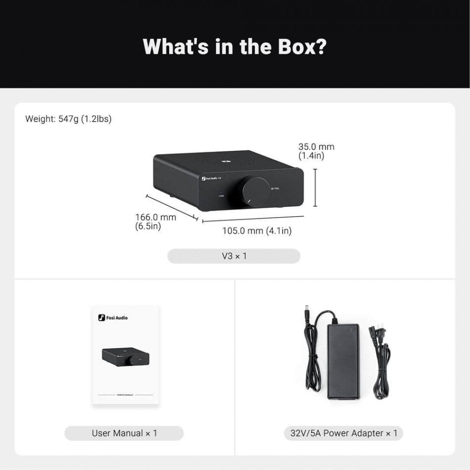 V3 er lille udenpå men kapabel indeni. Med den medfølgende 32 V strømforsyning leverer den stabil effekt og lav forvrængning, og skulle behovet for mere kraft opstå kan forstærkeren opgraderes med en stærkere PSU for at nå sit fulde potentiale.
