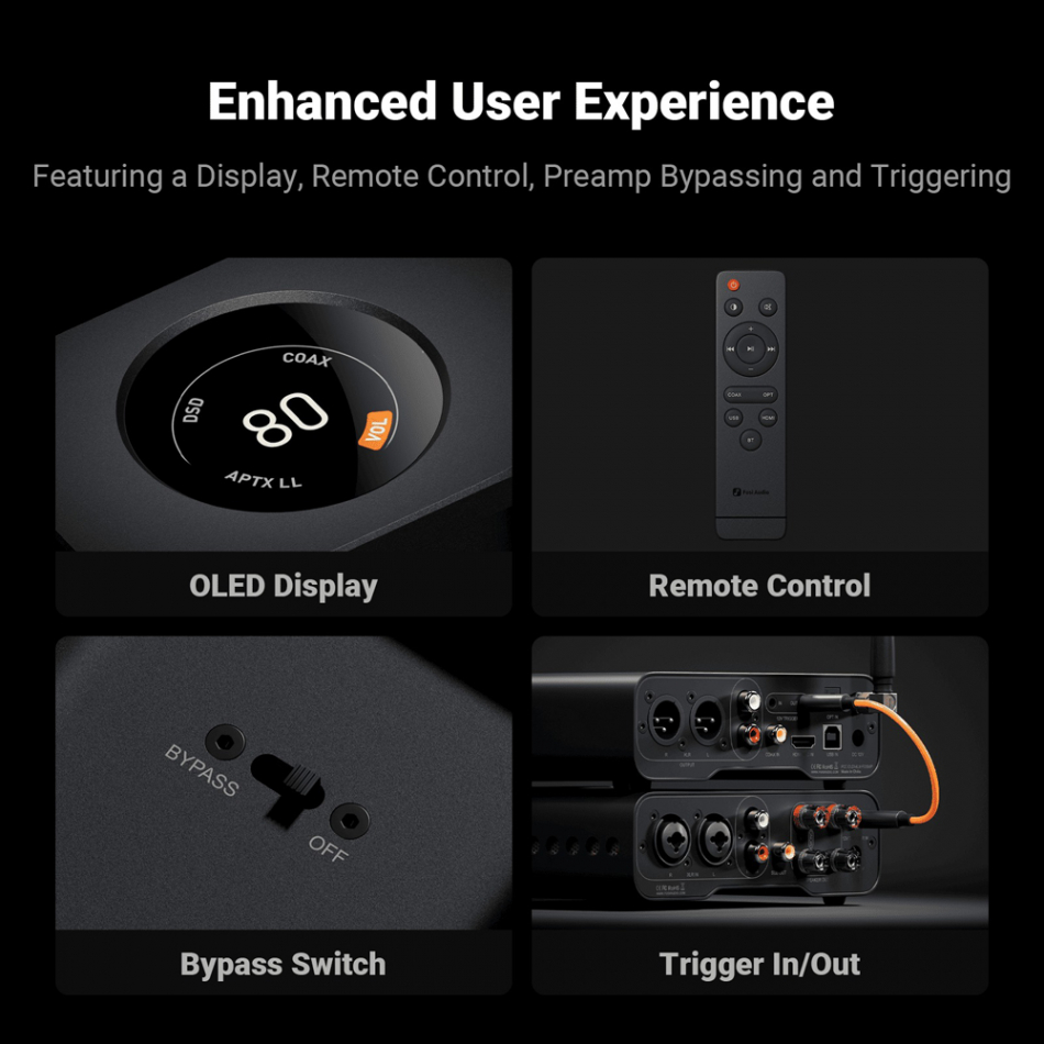 Kabinettet i CNC-fræset aluminium er både stilrent og effektivt afskærmet mod forstyrrelser. På fronten sidder et tydeligt OLED-display, der giver hurtig oversigt over indgang og opløsning. En fjernbetjening er inkluderet, og via 12 V trigger kan du synkronisere tænd og sluk med øvrigt udstyr.