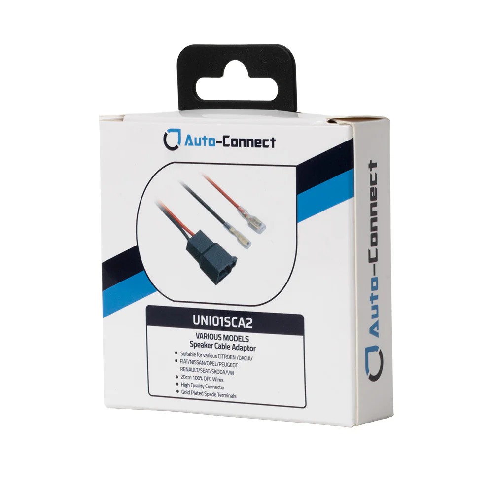 Auto-Connect UNI01SCA2 er et par højtalerkontakter til dig, der ønsker at udskifte bilens originale højtalere med eftermarkeds-højtalere uden at klippe i kablerne. Med den rette adapter mellem bilens originale kontakt og højtalerens fladstik bliver installationen både hurtigere, flottere og fuldstændig reversibel.