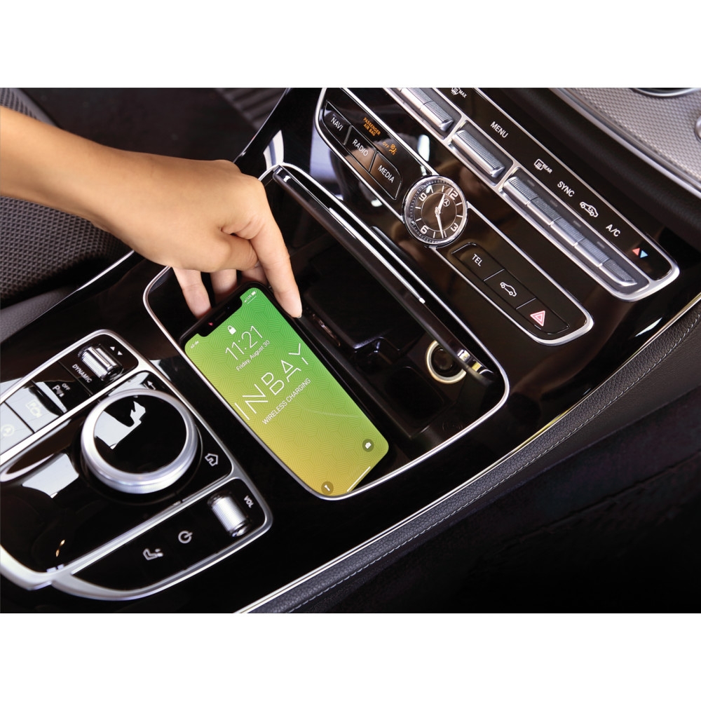 INBAY® lommen er designet til ikke at forstyrre bilens bussystem eller elektroniske systemer, hvilket sikrer, at lydmodtagelse for AM/FM/DAB+ ikke påvirkes. Det er vigtigt, at der ikke er metalgenstande mellem ladeenheden og smartphone for at sikre korrekt funktion. Bemærk, at beskyttende etuier ikke må indeholde metalkomponenter.