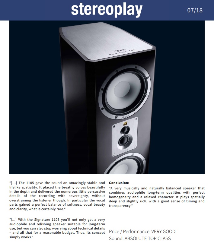 Signature 1105 är den mindre golvmodellen i serien, som Magnat själva kallar för referensklass. Högtalarna har ärvt mycket av storebrors upplösta och klassledande ljudåtergivning, där man minskat dess fysik. Något som ger ett bättre avvägning till mellanstora rum och en större anpassning av förstärkare, som inte behöver vara effektstarka monster.