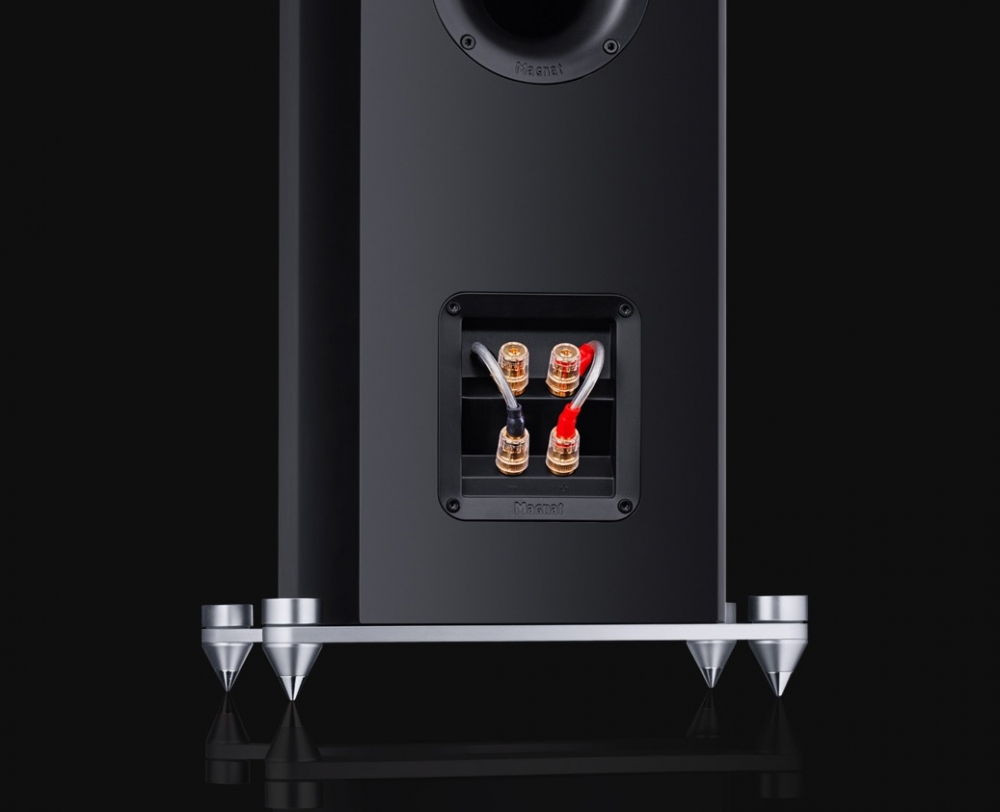 Men en bra högtalare är ingenting utan ett välgjort delningsfilter. Mycket av högtalarnas karaktär ligger här. Här finner vi ett fas- och amplitudoptimerat APOC-filter med audiofil-klassade spolar och PP-kondensatorer. Även det interna kablaget håller högre klass än genomsnittet. En av många avgörande detaljer ser vi även på byglingen i anslutningsterminalen. Det är billigare att sätta dit ett stålbleck, men Magnat har valt att göra det hela på rätt sätt genom att sätta dit en kabeljumper.