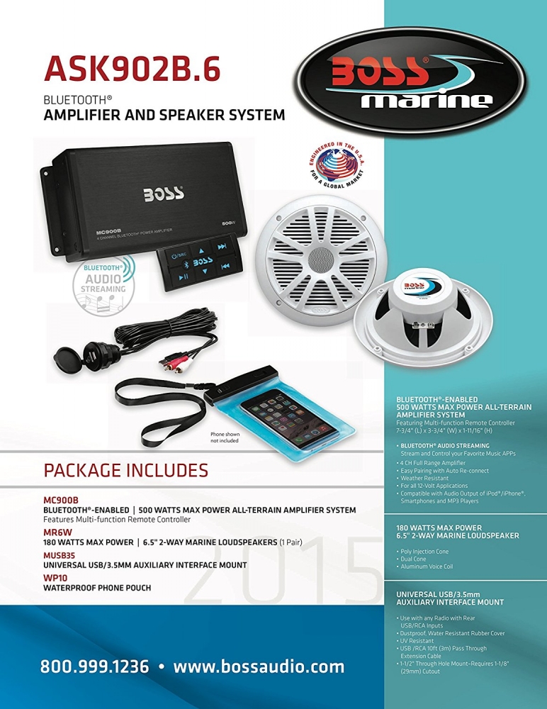 BOSS MC900B är en liten bluetoothförstärkare som levererar 4x125W i 4 ohm! En enkel och smidig lösning om du vill koppla in högtalare i båten och vill styra detta trådlöst! Med en kontrollpanel som du kan montera på önskad plats kan du styra enheten och välja från vilken ljudkälla du vill spela upp ifrån! Monteringsbar kontrollpanel med 6m kabel
