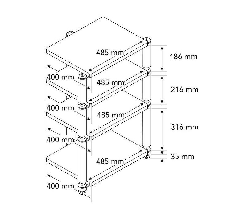 Hver hylde kan bære op til 50 kg belastning og leveres med spikes og beskyttelse for optimal stabilitet. Hyldernes forskellige højder gør det nemt at optimere pladsen til forstærkere, DAC'er, streamere og andre komponenter – uden at gå på kompromis med hverken æstetik eller funktionalitet.