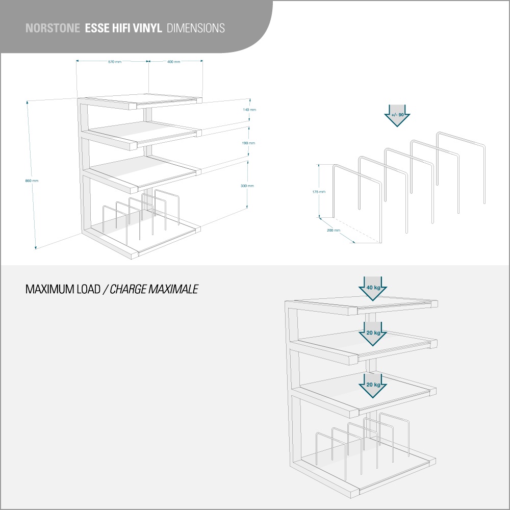 Norstone Esse Hifi Vinyl är en stereobänk vars klassiska och samtidigt tidslösa design blir ett välkommet inslag i hemmet. Med fyra hyllplan i 6 mm härdat glas och en pulverlackerad svartblank stålstomme, får du plats med tre apparater, samt din vinylsamling på bottenplanet. Dessutom är det fri yta baktill ifall man behöver ge plats åt utstickande kablar. Ett coolt och stilfullt rack!