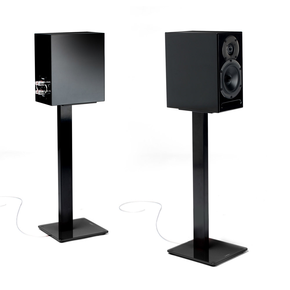 Högtalarstativ med pianosvart stomme och en svart fot, designmatchad till Esse-bänkarna.