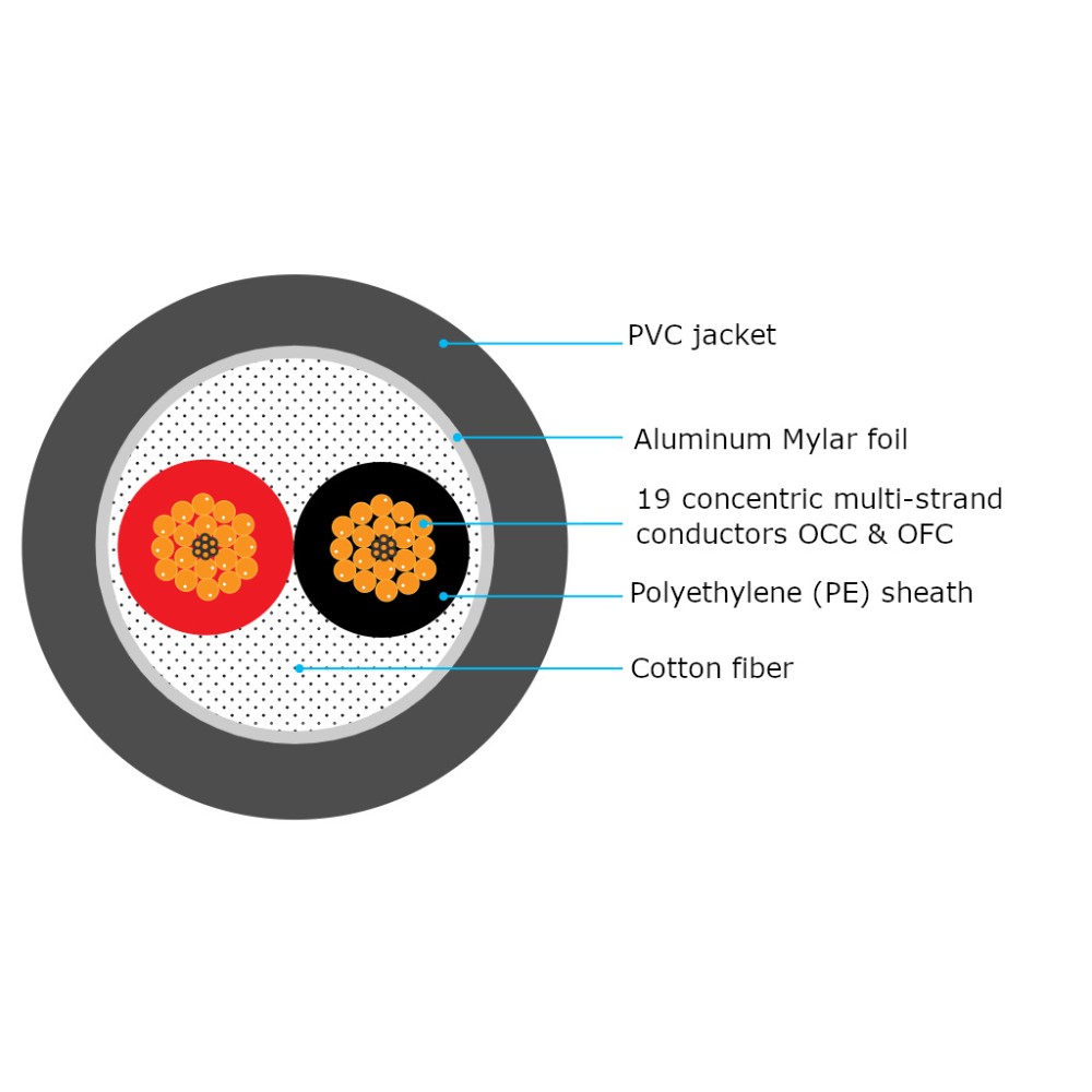 Den tredelte afskærmningsløsning er konstrueret til at eliminere både elektromagnetiske forstyrrelser og mekaniske mikroresonanser. Bomuldsfibre i kernen dæmper mikro-vibrationer som ellers kan påvirke ledernes indbyrdes position. Aluminium mylar-laget omslutter hele konstruktionen og holder støjniveauet nede selv tæt på strømkabler eller aktive komponenter. Resultatet er et lydbillede der opleves renere, med tydeligere ruminformation og stabilere instrumentplacering.