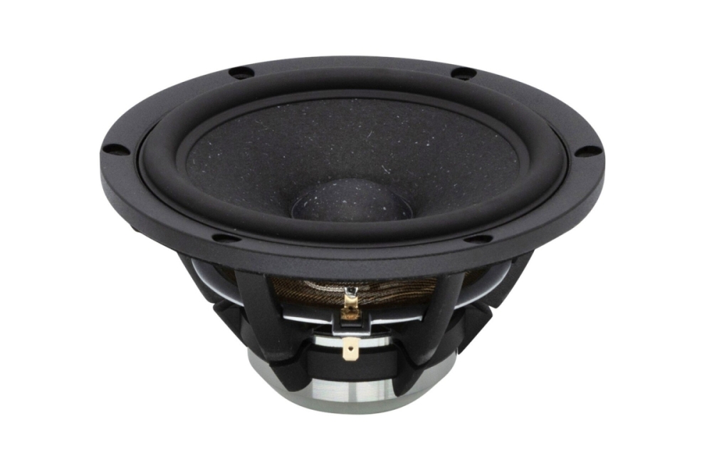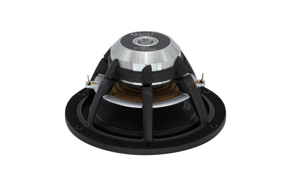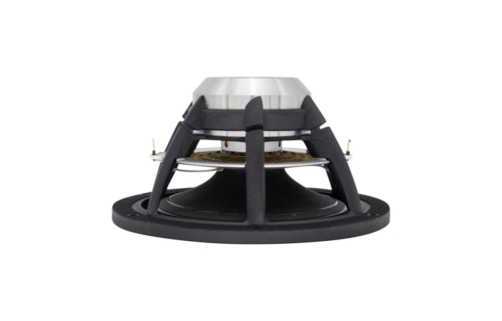 Det ventilerede aluminiumschassis er aerodynamisk designet for lav kompression og høj styrke, hvilket giver stabil montering og minimerer lydtab. Talspolen er ventileret og har en ikke-ledende glasfiberform, der reducerer dæmpning og varmeopbygning. Gummiophænget har lav dæmpning for at sikre hurtig og præcis bevægelse i membranen. Sammen giver dette et robust element, der passer i avancerede højttalerkasser med god køling og lav resonans.