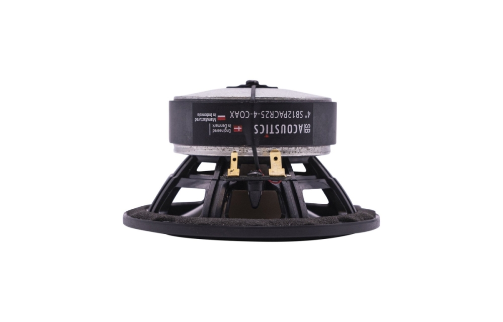 SB Acoustics SB12PACR25-4-COAX er en 122 mm (4") koaksialhøjttaler fra PAC-serien, som passer perfekt til kompakte bil- og lydsystemer. Den anodiserede aluminiumskegle og det store ventilerede motorsystem giver lav forvrængning og effektiv køling, hvilket resulterer i en klar og dynamisk lyd med god detaljering. Den kompakte dome-diskant med stor surround sikrer en jævn gengivelse af højfrekvenser, samtidig med at den lave impedans på 4 ohm gør højttaleren let at drive med de fleste forstærkere.