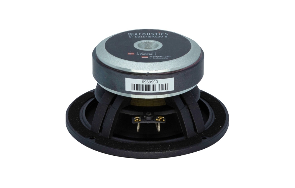 SB Acoustics SB15NBAC30-8 er en 5-tommer bas/mellemtone med geometrisk forstærket aluminiumskegle og ventileret støbt aluminiumchassis, som giver stabil og effektiv membranbevægelse. Den bløde gummiring og CCAW-talspole bidrager til lav forvrængning og god dynamik, hvilket gør den egnet til høj kvalitets lydsystemer, hvor tydelig mellemtone og bas er vigtigt.