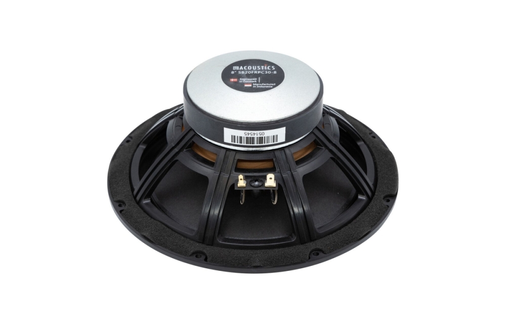 SB20FRPC30-8 har standardmål med en indbygningsdiameter på 187 mm og monteringsdybde på cirka 94 mm, hvilket gør det nemt at integrere i mange kabinetter og højttalerbyggerier. Den ventilerede plastkurv giver stabilitet samtidig med at den holder vægten nede. Med otte monteringshuller og en boltcirkeldiameter på 182,5 mm passer det i mange eksisterende chassiser.