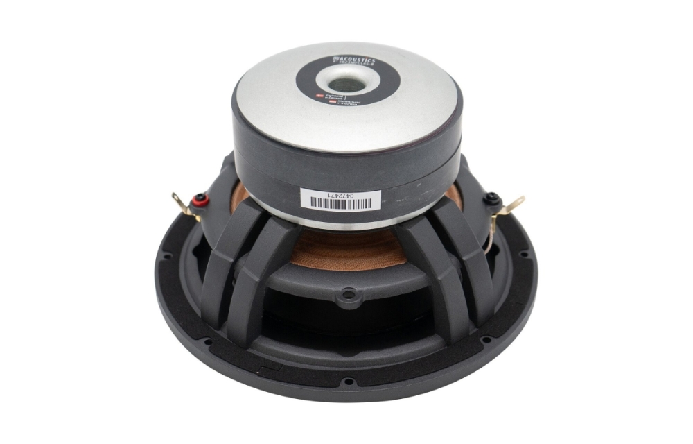 Elementets mineralfyldte polypropylenmembran giver en stiv og kontrolleret membranflade, der minimerer uønskede resonanser. Den langslagige design kombineret med en lavdæmpet gummiophængning giver høj bevægelsesfrihed og god transientrespons. Takket være den ventilerede aluminiumskurv og motorsystemet holdes temperaturen nede, hvilket giver stabil ydeevne selv ved høje effektniveauer. Det betyder, at du får en kraftfuld og præcis bas, som passer både i kompakte og mellemstore subwooferkasser.