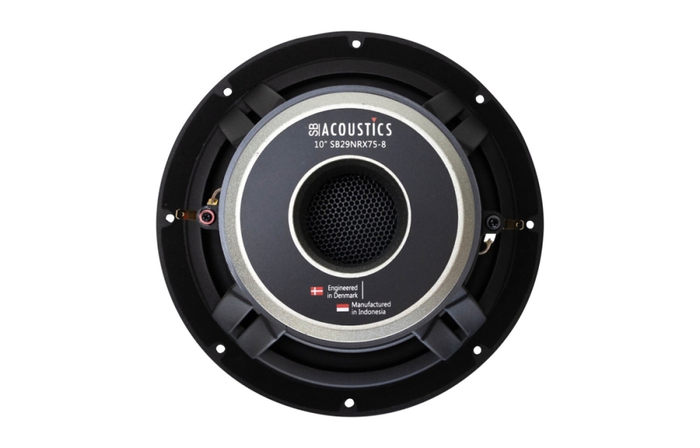 SB Acoustics SB29NRX75-8 er et 290 mm (10") basselement i NRX-serien, designet til at levere dyb, kontrolleret bas og ren gengivelse af de lavere mellemtoneområder. Med en stiv papirkegle (Norex) og en ventileret aluminiumsramme kombineres høj mekanisk stivhed med effektiv køling, hvilket reducerer kompression og muliggør langvarig høj belastning. Elementets 3-tommer kobber-talspole og naturgummiophæng giver høj effekttolerance, lav forvrængning og smidig dynamik, hvilket gør det velegnet til både lukkede og basreflekskasser i to- eller trevejs systemer.