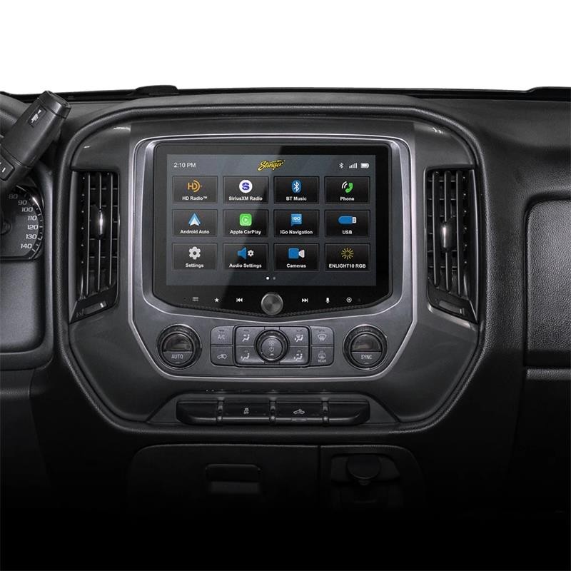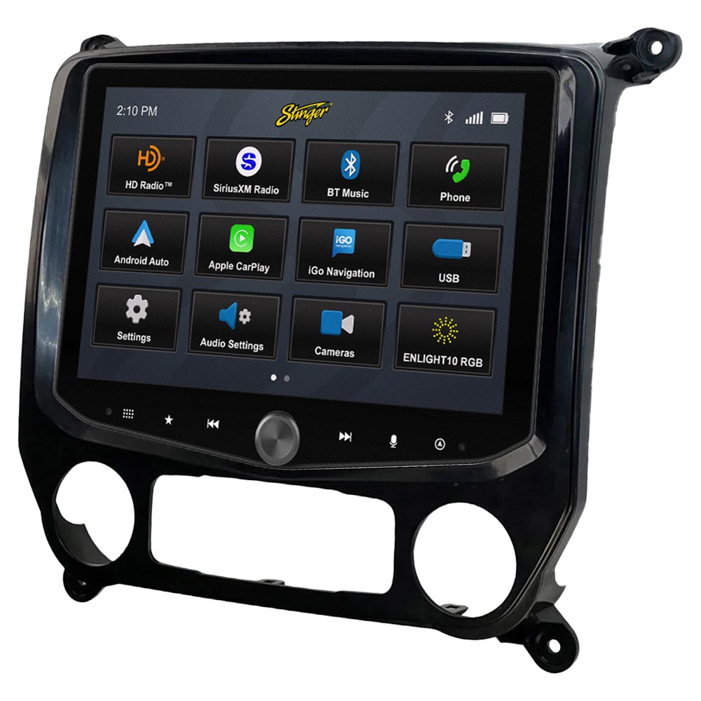 Stinger HORIZON10 iX210E-GM1 er et komplet infotainment-kit til Chevrolet Silverado 2014-2019 og GMC Sierra 2014-2019, udviklet til at erstatte den originale stereo med en højopløselig 10-tommers touchskærm og fuld smartphone-integration. Pakken er modeltilpasset og plug-and-play, bevarer bilens systemer og funktioner og tilføjer avanceret tilslutning, IP65-skærmbeskyttelse, DAB og udvidede kørselsdata.