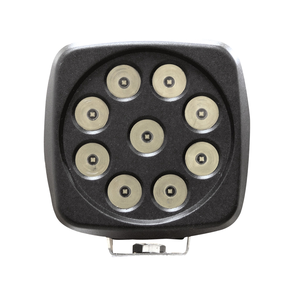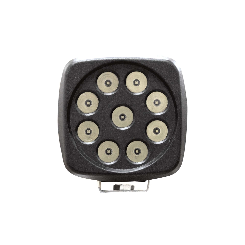 Kvadratisk 27W arbejdslys med 9 LED, kompakt og robust design, perfekt til krævende forhold. Leveres med kabel og DT-stik.