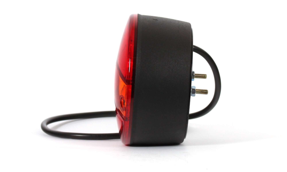 Rund LED baglygte med tre funktioner: baglys, bremselys og blinklys. Enkel design og nem at montere.