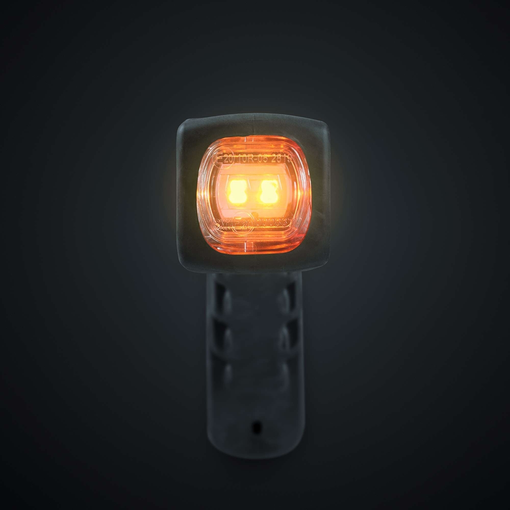 Kort gummiarm (højre) med positionslys og sidesignaler, let at montere, klart glas og en stilren finish. Alt-i-én løsning.